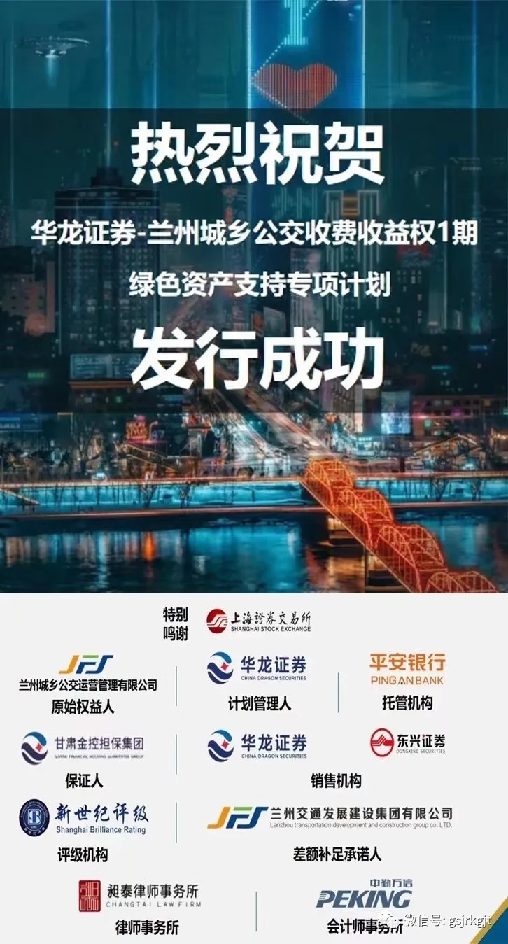 日前,由金控?fù)?dān)保作為保證人、華龍證券擔(dān)任計(jì)劃管理人的“蘭州城鄉(xiāng)公交收費(fèi)收益權(quán)1期綠色資產(chǎn)支持專項(xiàng)計(jì)劃”成功發(fā)行,這也是甘肅首單綠色資產(chǎn)支持專項(xiàng)計(jì)劃。