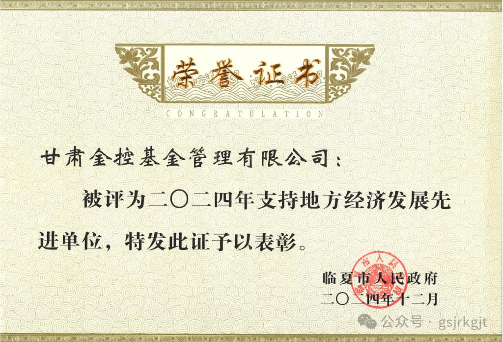 近日,甘肅金控基金管理有限公司被臨夏市政府授予“2024年度支持地方經濟發展先進單位”榮譽稱號,這是地方政府對金控基金在服務實體經濟、支持地方產業和促進縣域經濟高質量發展等方面工作的高度肯定,也是對金控基金和市州擔保公司業務協同發展的激勵。